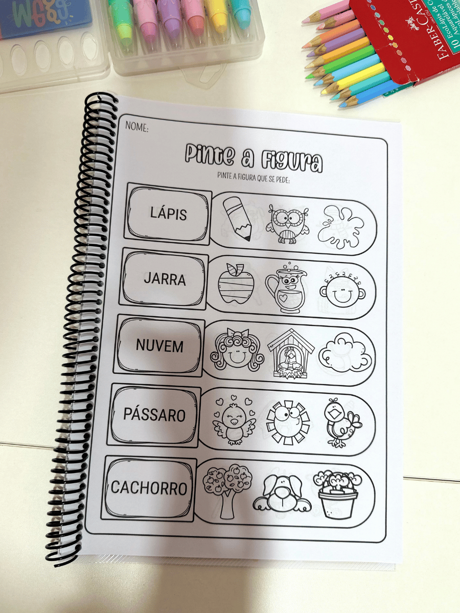 O arquivo vai com 16 páginas de atividades para colorir. Nessa proposta a criança precisa realizar a leitura da palavra e pintar a figura correspondente.