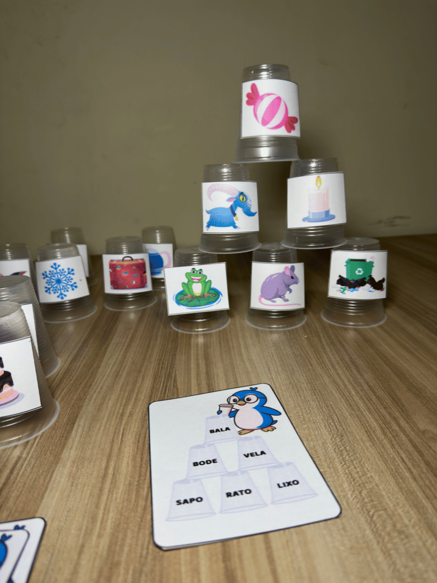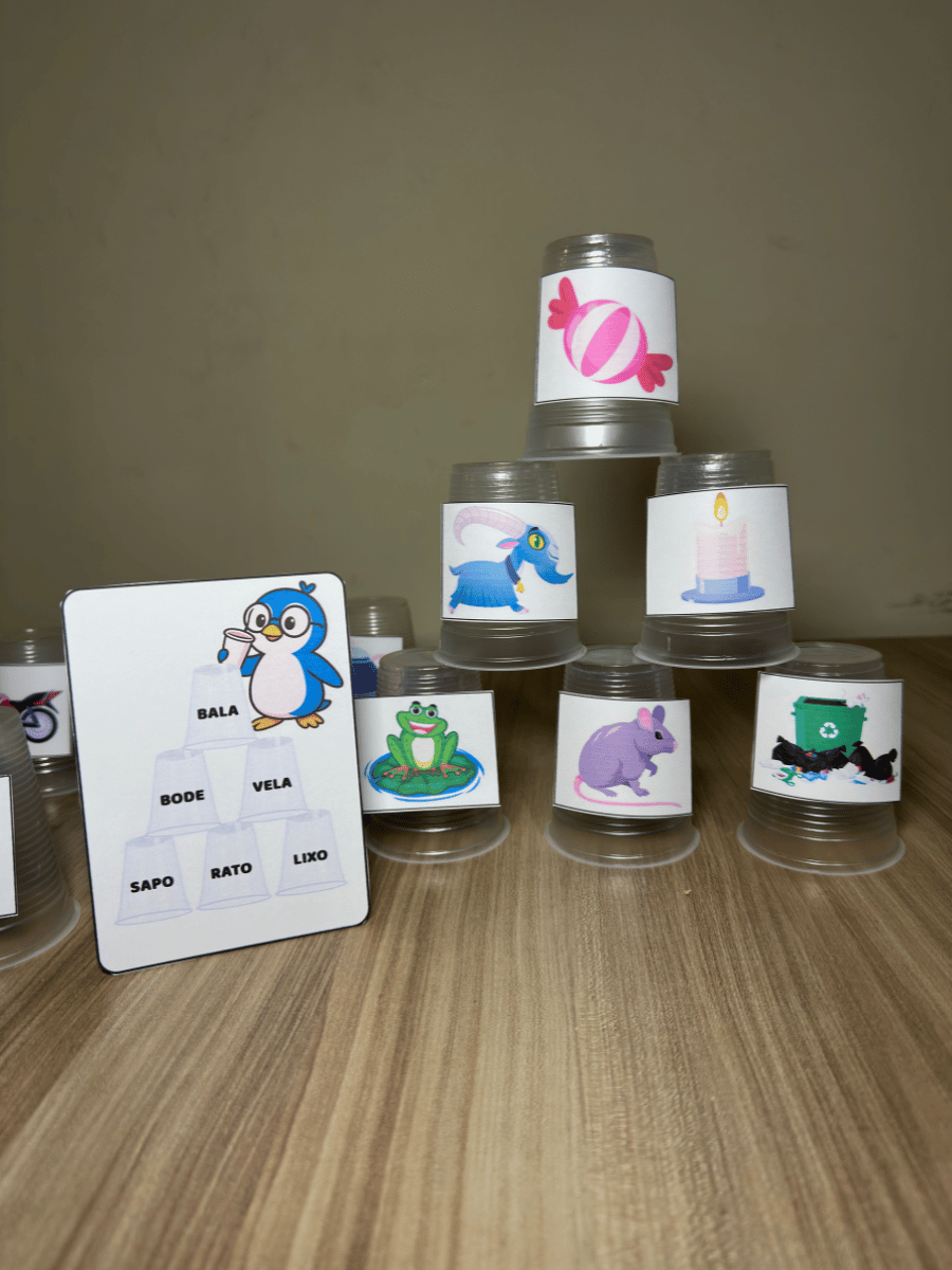 Um recurso lúdico e envolvente que transforma copos descartáveis em ferramentas pedagógicas. A criança deve empilhar os copos de acordo com a ficha ilustrada, formando as palavras corretamente.