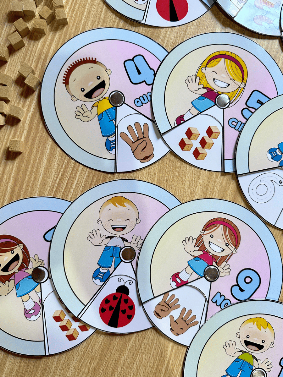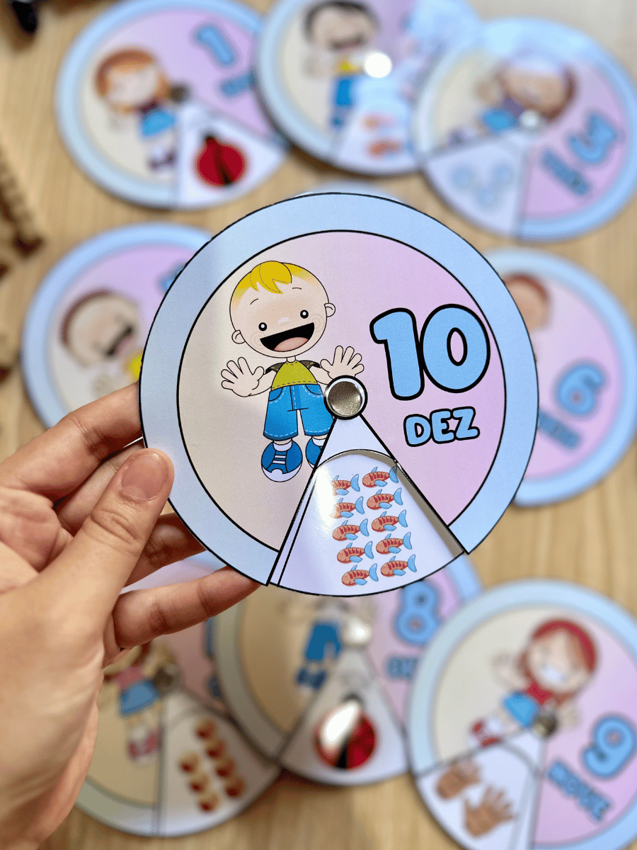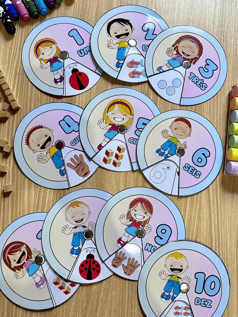 Arquivo com roletas interativas dos numerais de 1 a 10 para desenvolver conceitos quantitativos com crianças da educação infantil. A roleta dos numerais interativa é uma excelente ferramenta pedagógica para auxiliar no aprendizado dos números e quantidades para crianças da educação infantil.